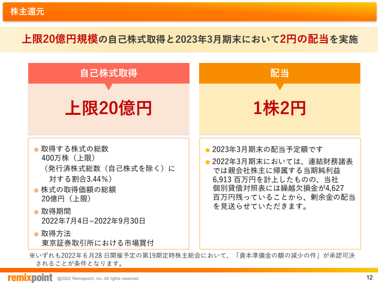 そして上限20億円規模の自己株式取得と2023年3月期末において2円の配当を実施