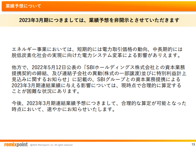 2023年3月期連結業績に与える影響については、現時点で合理的に算定することが困難な状況で業績予想を非開示となりましたが