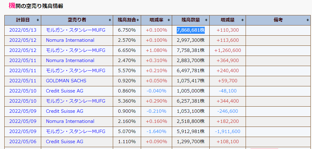 このように現在株価が暴騰中のリミックスポイントですが、大量に空売りをしているモルガン・スタンレーMUFG証券の空売り残高はどうなっているかというと