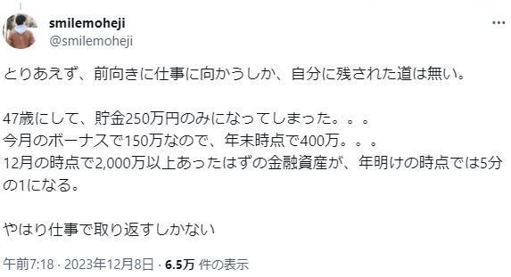 47歳にして、貯金250万円のみになってしまった。。。
