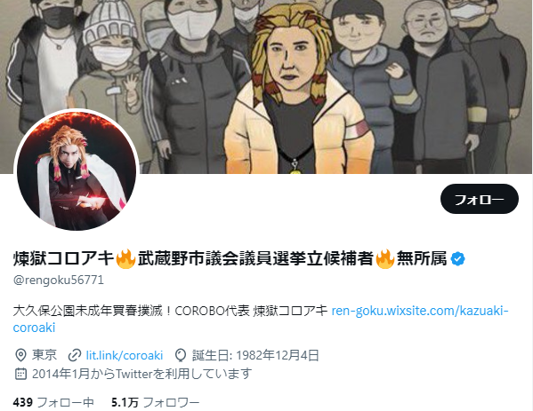武蔵野市議会議員選挙に立候補して落選した煉獄コロアキ氏
