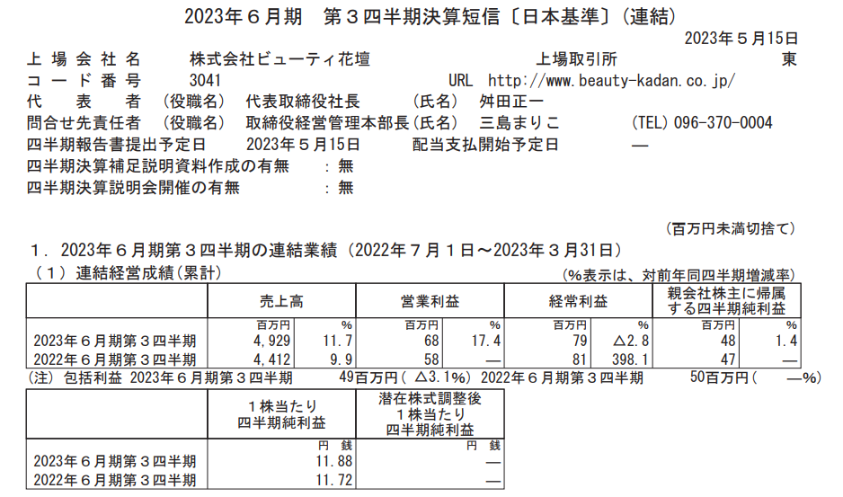 各事業ともに引き続きコロナ禍から総じて回復基調にあったことや生花卸売事業において販売単価が上昇したこと等から、当第3四半期連結累計期間における当社グループの売上高は、前年同期比11.7%増、営業利益は前年同期比17.5%増、経常利益は前年同期比2.8%減、親会社株主に帰属する四半期純利益は前年同期比1.4%増となり