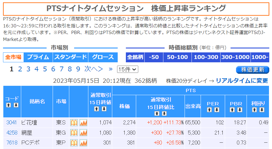 ビューティ花壇は15日のPTSナイトタイムセッションでも株価上昇率ランキング1位で