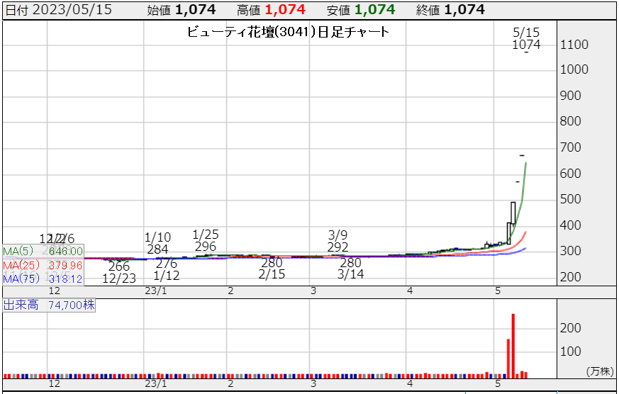 しかもビューティ花壇はPTSでストップ高張り付きで、株価は2,274円まで上昇しています