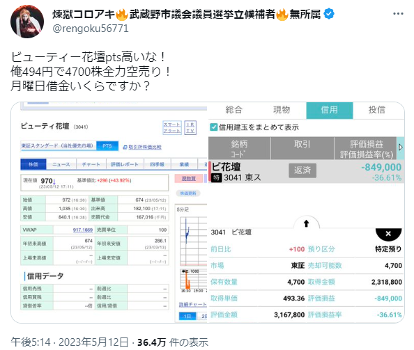 そしてビューティ花壇を信用全力で494円で4700株空売りした煉獄コロアキ氏