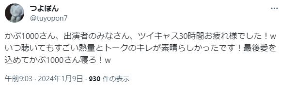 と、かぶ1000氏のツイートにあるように30時間も寝ることなく話し続けたようです