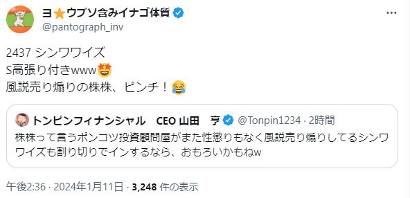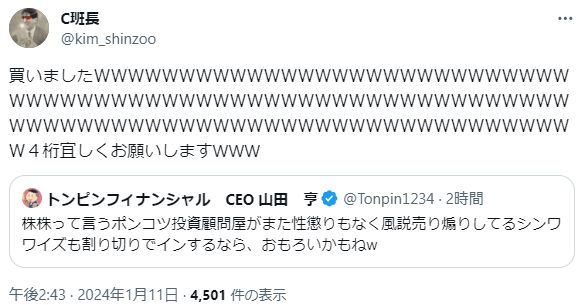 — トンピンフィナンシャル CEO 山田 亨 (@Tonpin1234) January 11, 2024
