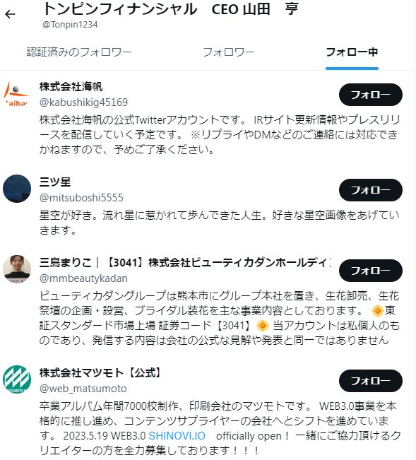 トンピン氏のTwitterアカウントでフォローしている銘柄