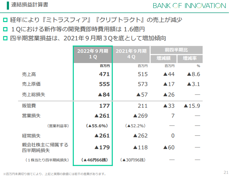 先月発表した22年9月期第1四半期の決算では