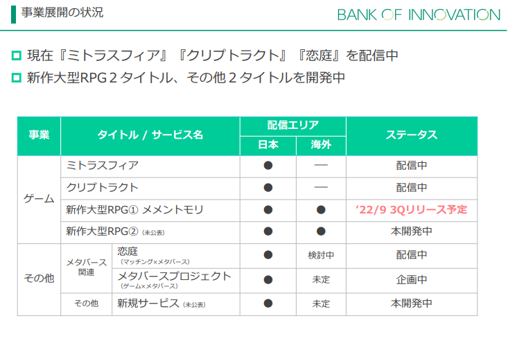 バンク・オブ・イノベーションとは、スマートフォンゲームの開発・運営を展開する会社です