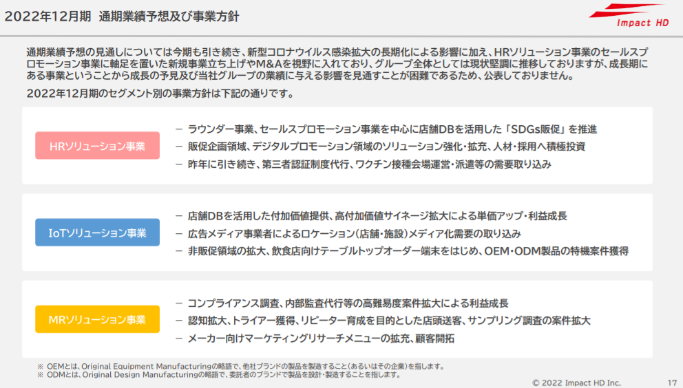 通期業績予想の見通しにつきましては、今期も引き続き、新型コロナウイルス感染拡大の長期化による影響に加え、HRソリューション事業のセールスプロモーション事業に軸足を置いた新規事業立ち上げやM&Aを視野に入れており、グループ全体としては現状堅調に推移しておりますが、成長期にある事業ということから成長の予見及び当社グループの業績に与える影響を見通すことが困難であるため、公表しておりません。