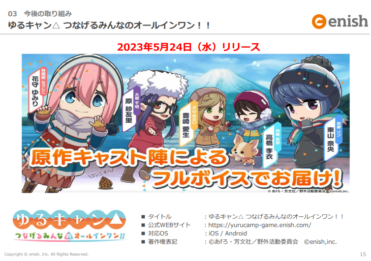 5月24日(水)に予定していたアプリ「ゆるキャン△ つなげるみんなのオールインワン!!」のサービス開始につきまして、さらなる品質向上、サーバーの安定性確保を図るため、リリースを2023年6月15日(木)に延期させていただきます。#つなキャン pic.twitter.com/q3zpwVShzw