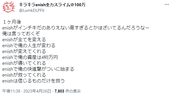 キラキラenish全力スライム@100万氏は4月26日のツイートで