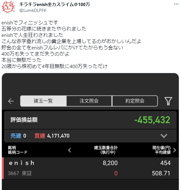 そんな信じていたenishが延期発表で株価が急落した際のツイートですが