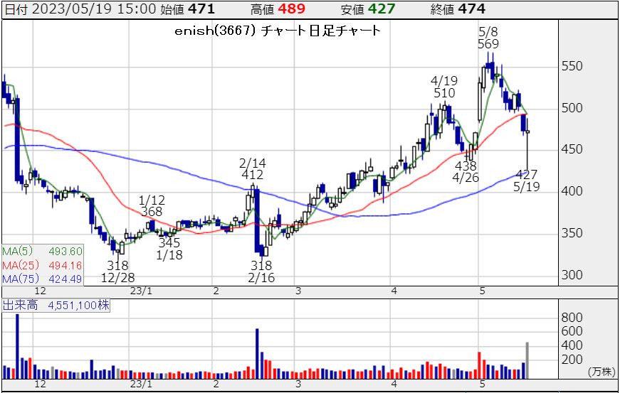 enishは予想通りの下髭、427円で買った人プロだわwこのまますぐ25MAを上抜けていくと思われ