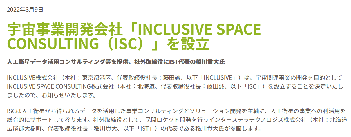 宇宙事業開発会社「INCLUSIVE SPACE CONSULTING(ISC)」を設立を発表しました
