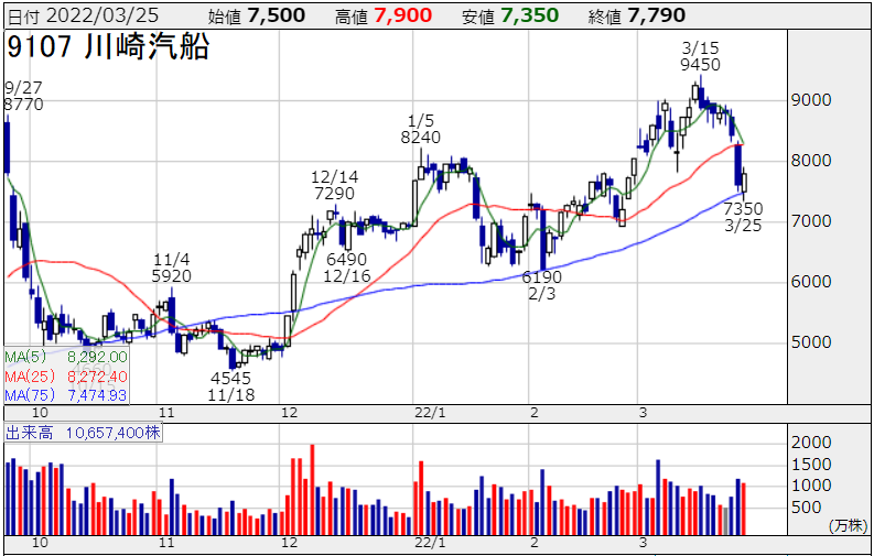 現物で川崎汽船のみ保有してますがこのまま沈没してしまうのか再度大相場やってくるのか楽しみです👋#myTrade pic.twitter.com/b8L7FubvOm— 犬丸 (@inumaru_EXam) March 26, 2022