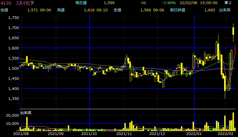 カカムーチョはスガイ化学工業(4120)の株式を7万株(約5.1%)取得し、筆頭株主になりました。後日、大量報告書を提出します。ちょうど先程、決算発表をしましたね。上方修正と自社株買い。