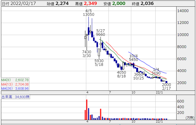 これは週足チャートですが、4月5日に上場来高値13050円まで上昇した後は株価は下げ続けています