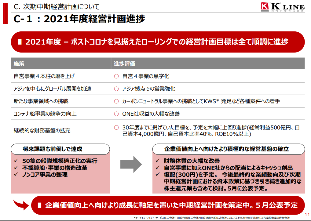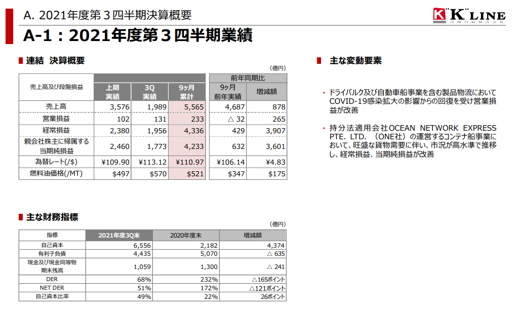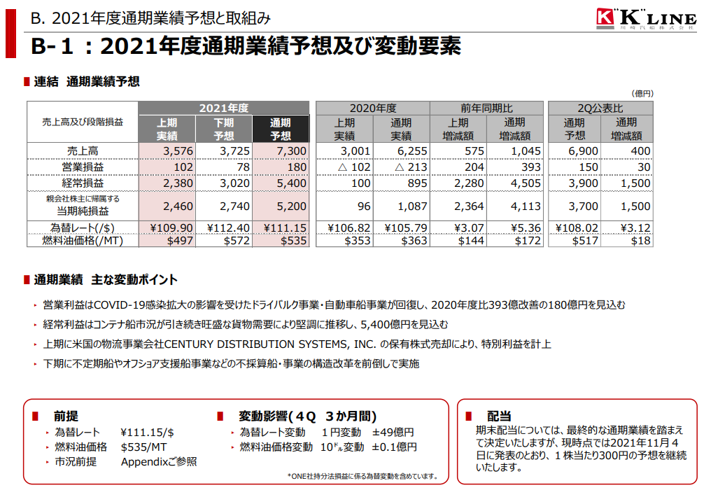 持分法適用会社OCEAN NETWORK EXPRESSPTE. LTD. の運営するコンテナ船事業において、旺盛な貨物需要に伴い、市況が高水準で推移し、経常損益、当期純損益が改善したことから業績は好調に推移し上方修正を発表しています