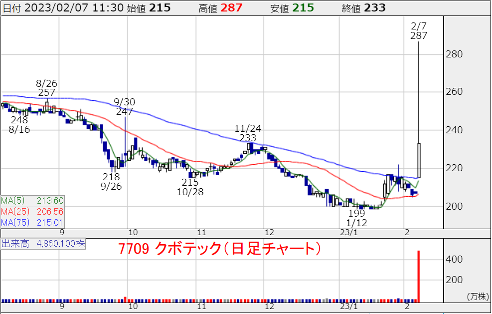 クボテックは前日比+38.6%の上昇となるストップ高まで株価は買われました