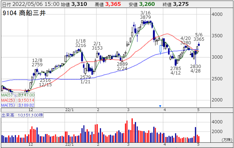 商船三井、知らんうちに分割前株価で1万超えてるし50日線も越えてんじゃん!めっちゃ強い証拠㊗️