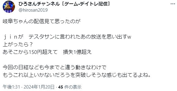 — 損切りできないマン (@losscuttt) January 17, 2024