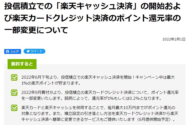 投信積立での「楽天キャッシュ決済」の開始および楽天カードクレジット決済のポイント還元率の一部変更について