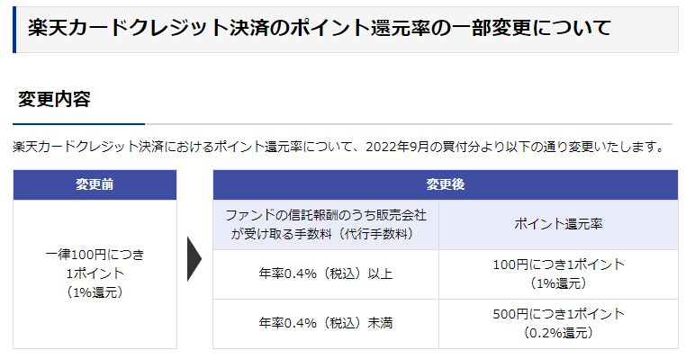 2022年9月買付分より、投信積立の楽天カードクレジット決済について、ポイント還元率を一部変更いたします。銘柄によって、還元率が1%もしくは0.2%となります。