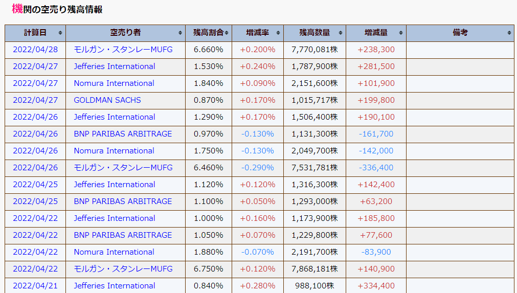 この株価の動きを受けて大量に空売りをしていたモルガン・スタンレーMUFG証券の空売り残高はどうなっているかというと