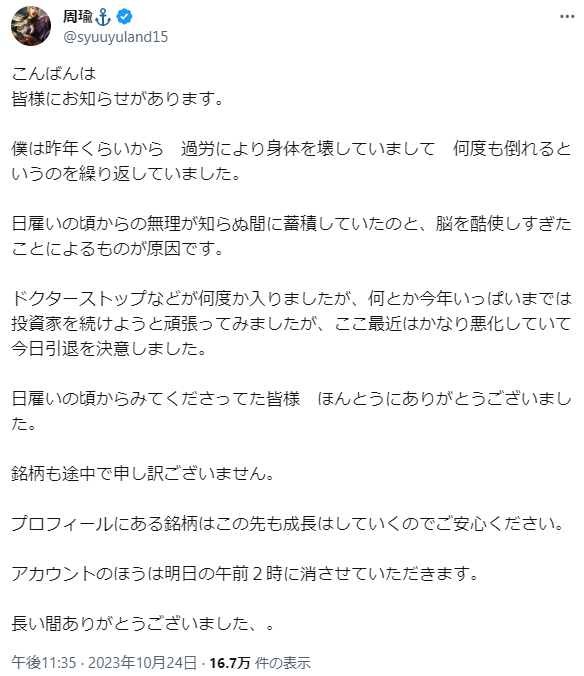 ドクターストップなどが何度か入りましたが、何とか今年いっぱいまでは投資家を続けようと頑張ってみましたが、ここ最近はかなり悪化していて 今日引退を決意しました。