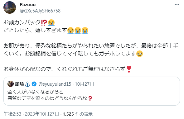 — 周瑜⚓ (@syuuyuland15) October 24, 2023