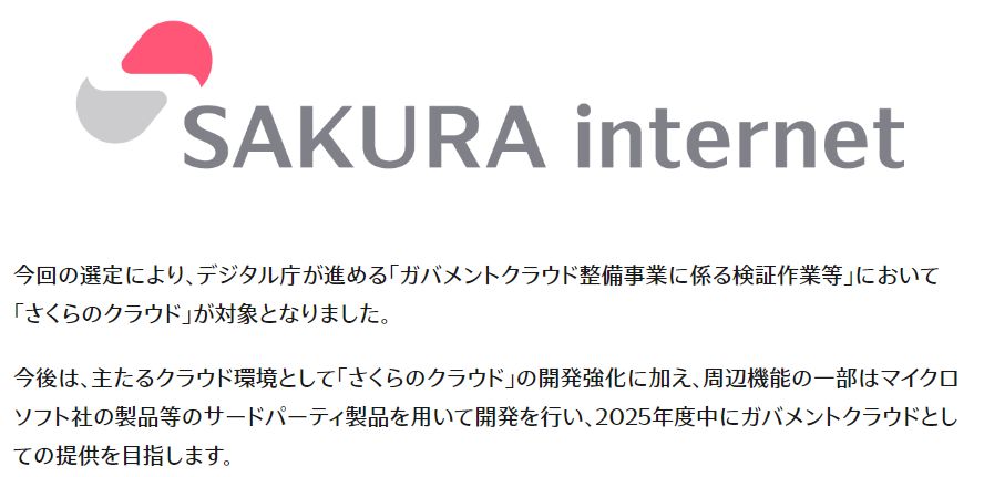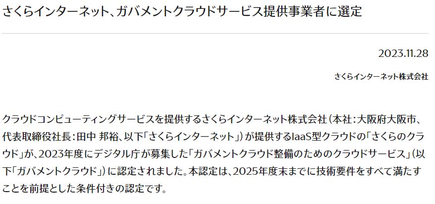 さくらインターネットは、去年11月28日にIaaS型クラウドの「さくらのクラウド」が、2023年度にデジタル庁が募集した「ガバメントクラウド整備のためのクラウドサービス」に認定されたことを発表しました