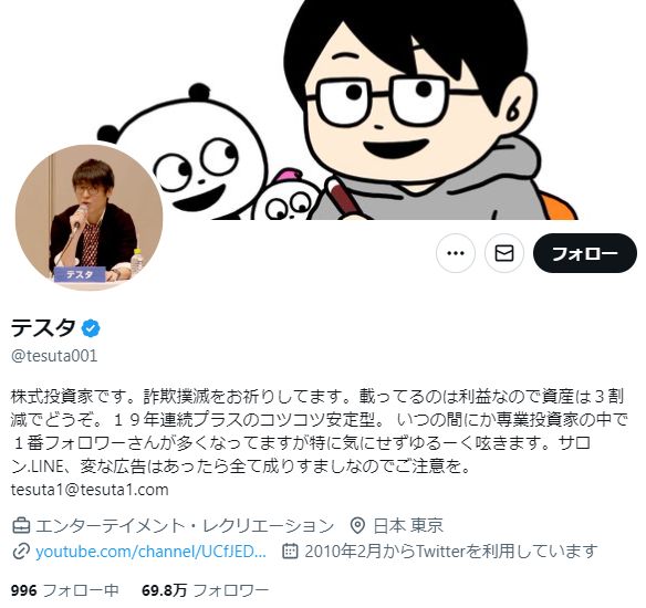 フォロワー数70万人のテスタ氏
