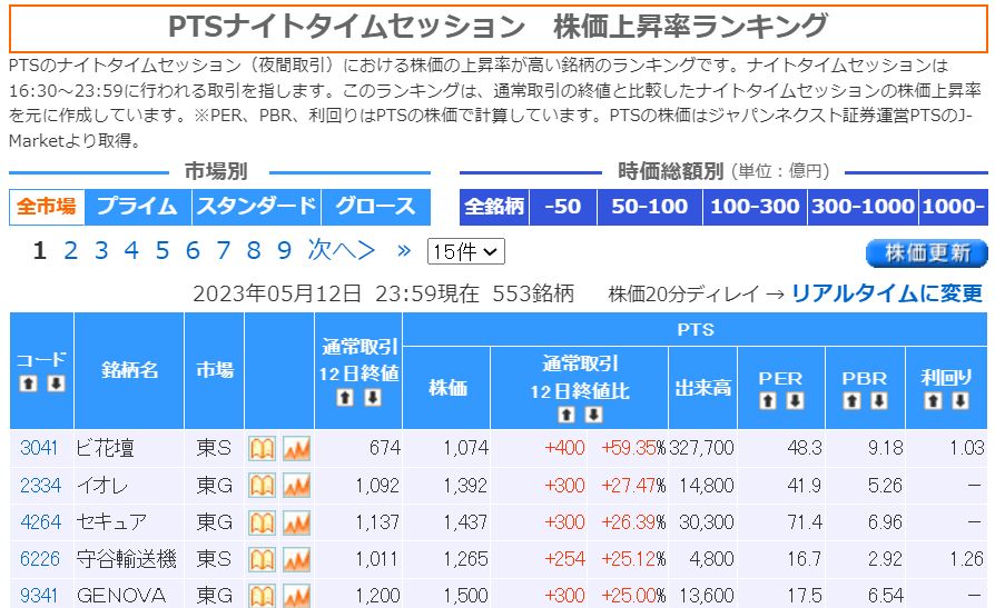 ビューティ花壇は、12日のPTSナイトタイムセッションでも株価上昇率ランキング1位で