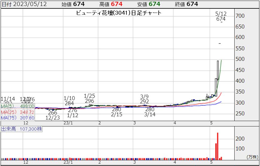 このビューティ花壇ですが、突如9日にストップ高まで買われました
