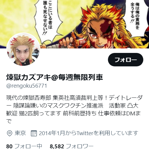 株クラにもイケメンの五条コスプレの人いた気がするけどデイトレーダーは39歳煉獄のほう…